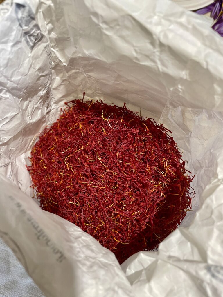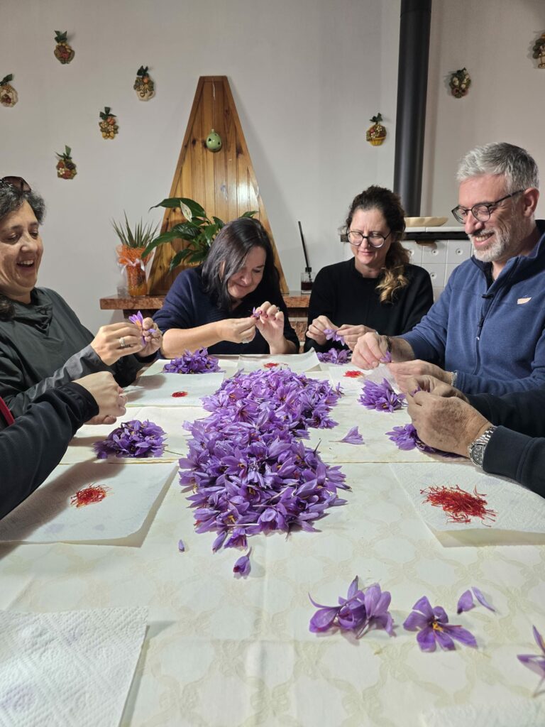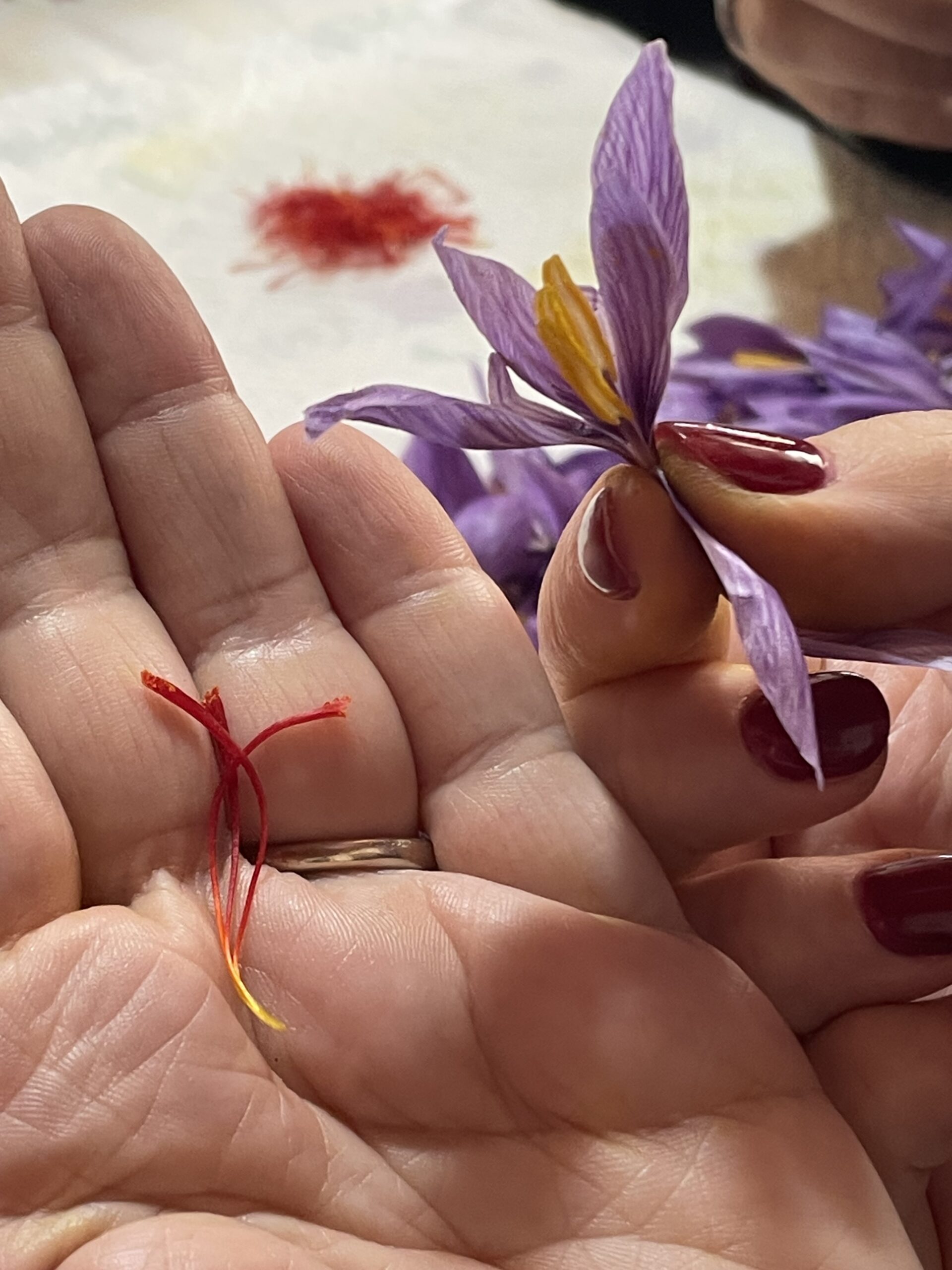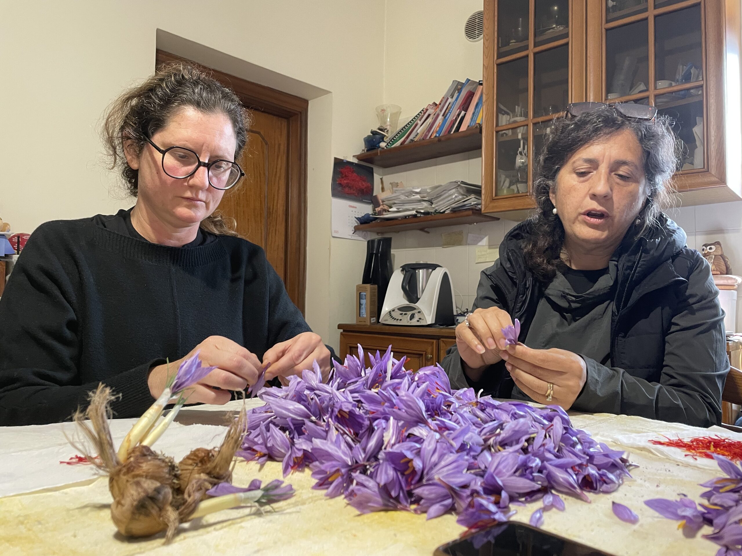 L’oro rosso – het rode goud – zo wordt saffraan in Italië ook genoemd. Na de koffie gaan we in de woonkamer met z’n allen rond de tafel zitten om met engelengeduld uit iedere krokus de drie lange dieprode stampers vakkundig weg te halen. Er valt geen tijd te verliezen, want dit werk moet onmiddellijk gebeuren nadat de bloemen van het veld komen. Van iedere bloem houden we maar drie draadjes over. We oogstten langzaam maar zeker karmozijnrode saffraan. Een monnikenwerk. Wat overblijft is een kleurrijke afvalberg (die later nog zal worden gebruikt om bijvoorbeeld wol te verven).