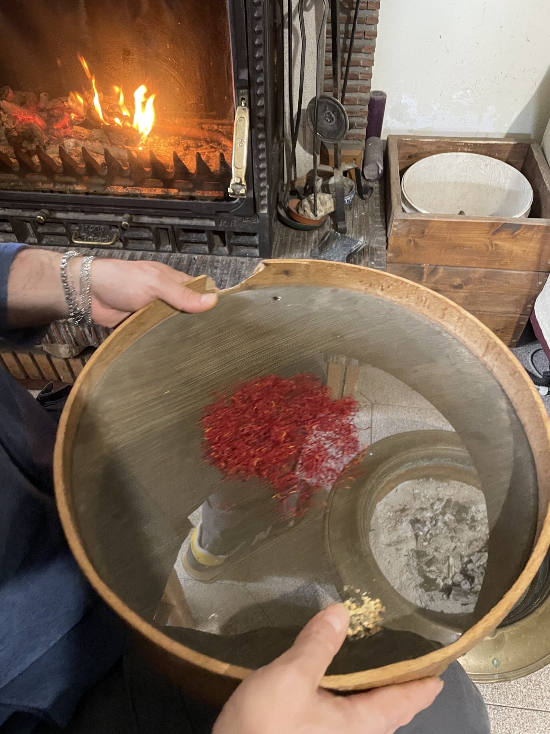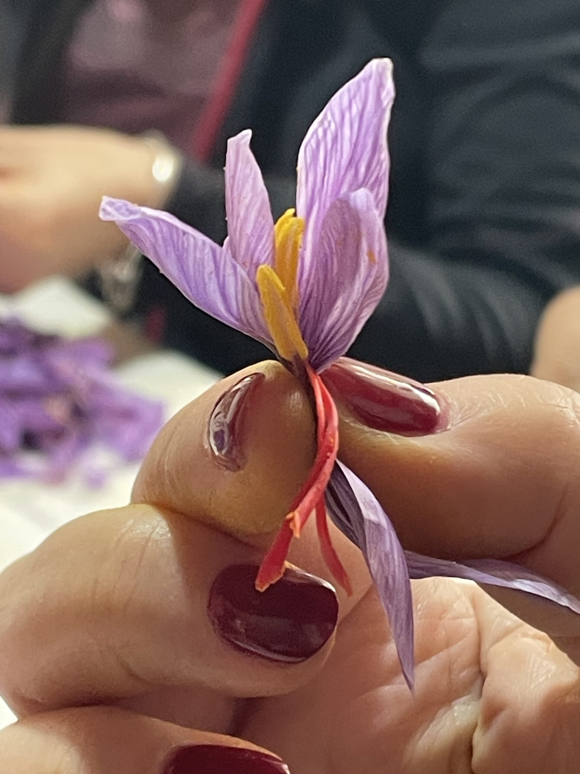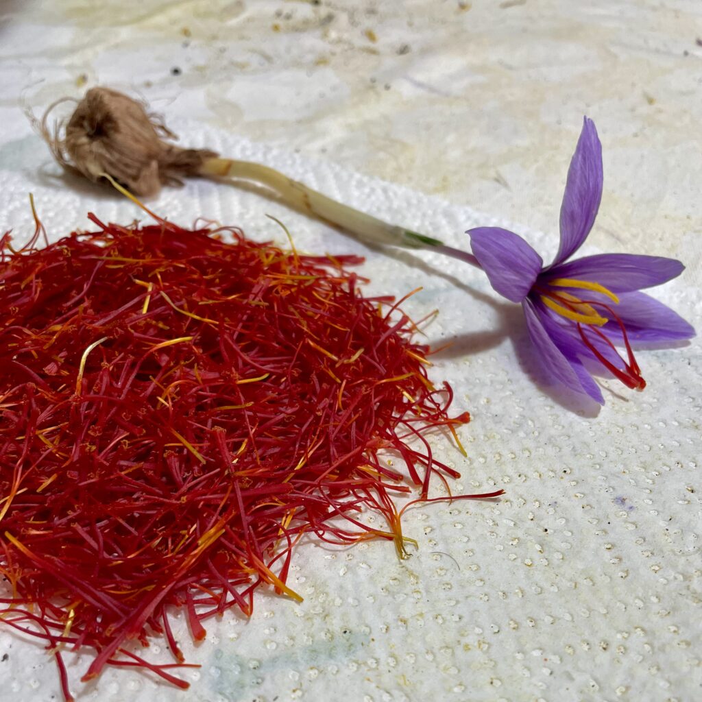 L’oro rosso – het rode goud – zo wordt saffraan in Italië ook genoemd. Na de koffie gaan we in de woonkamer met z’n allen rond de tafel zitten om met engelengeduld uit iedere krokus de drie lange dieprode stampers vakkundig weg te halen. Er valt geen tijd te verliezen, want dit werk moet onmiddellijk gebeuren nadat de bloemen van het veld komen. Van iedere bloem houden we maar drie draadjes over. We oogstten langzaam maar zeker karmozijnrode saffraan. Een monnikenwerk. Wat overblijft is een kleurrijke afvalberg (die later nog zal worden gebruikt om bijvoorbeeld wol te verven).