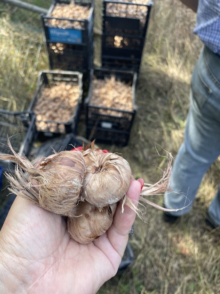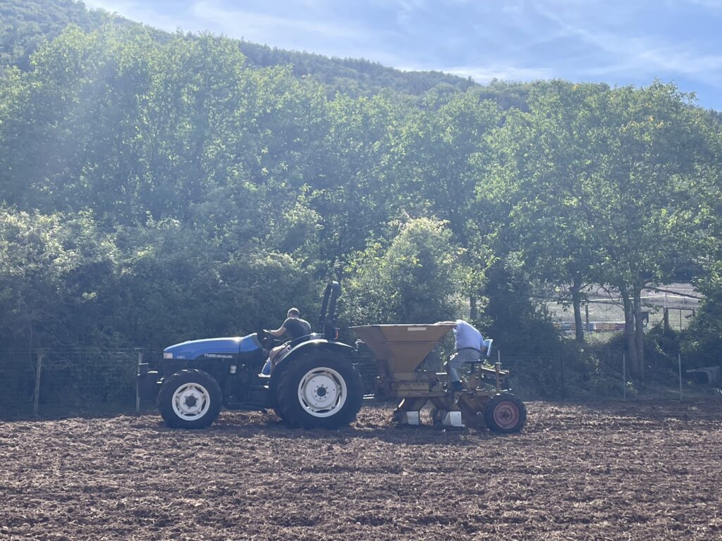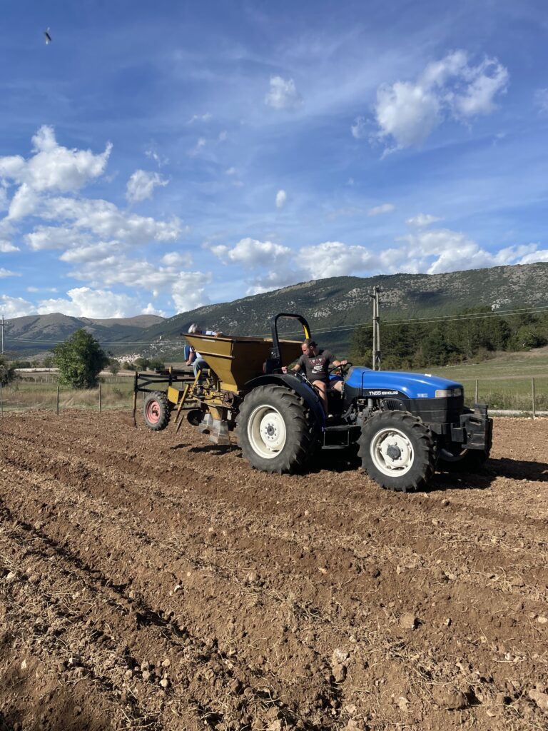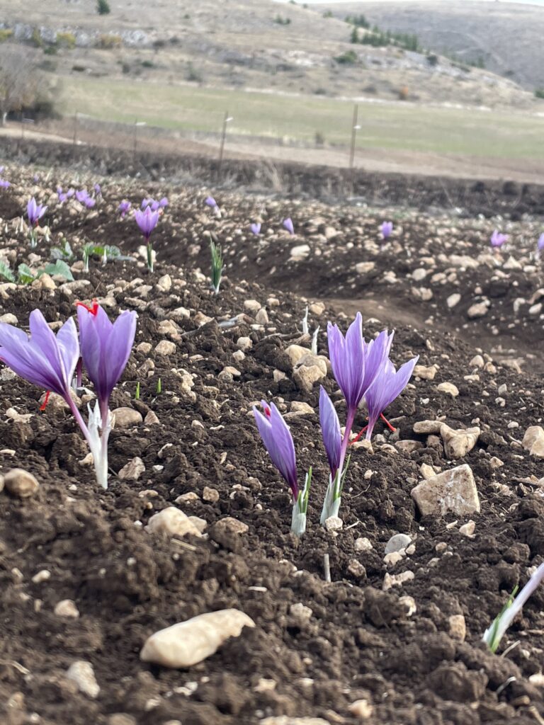 In augustus 2025 ging ik praten met Dina van de Cooperativa Altopiano di Navelli, en mocht ik samen met Valentino het veld op. Tot mijn grote verbazing waren de saffraanvelden relatief klein, en zorgvuldig omheind. Dat is noodzakelijk, want everzwijnen zijn dol op de knollen van de Crocus sativus, en richten anders ravages aan. Ik zag hoe de krokusknollen massaal in kistjes werden aangevoerd en netjes op regelmatige afstand van elkaar werden aangeplant. In Navelli blijven de knollen niet jaar na jaar in de grond zitten zoals dat in vele streken wel het geval is. Ik begreep dat daardoor de manier van werken nog arbeidsintensiever is dan in andere regio’s, maar die inspanning loont.