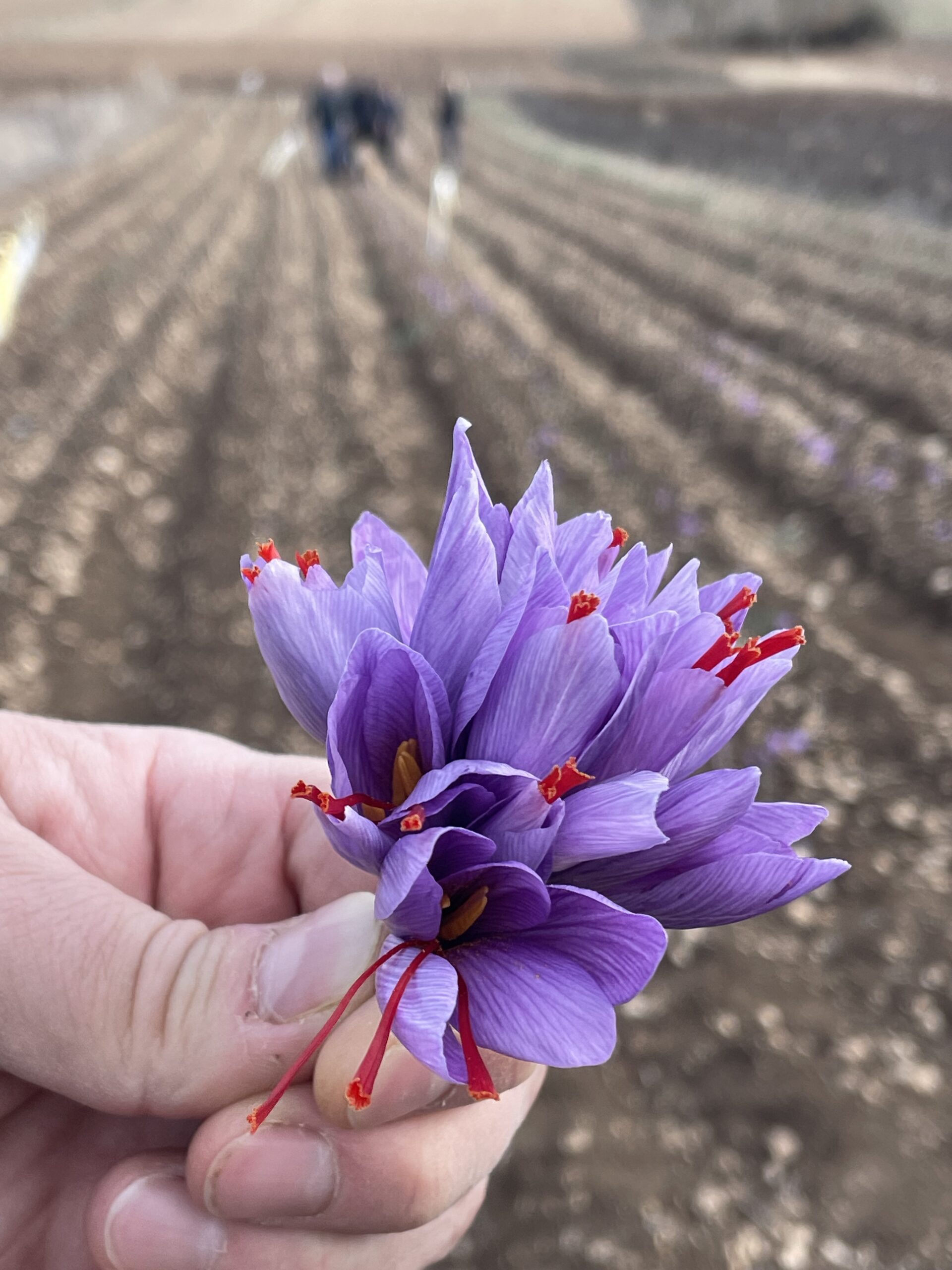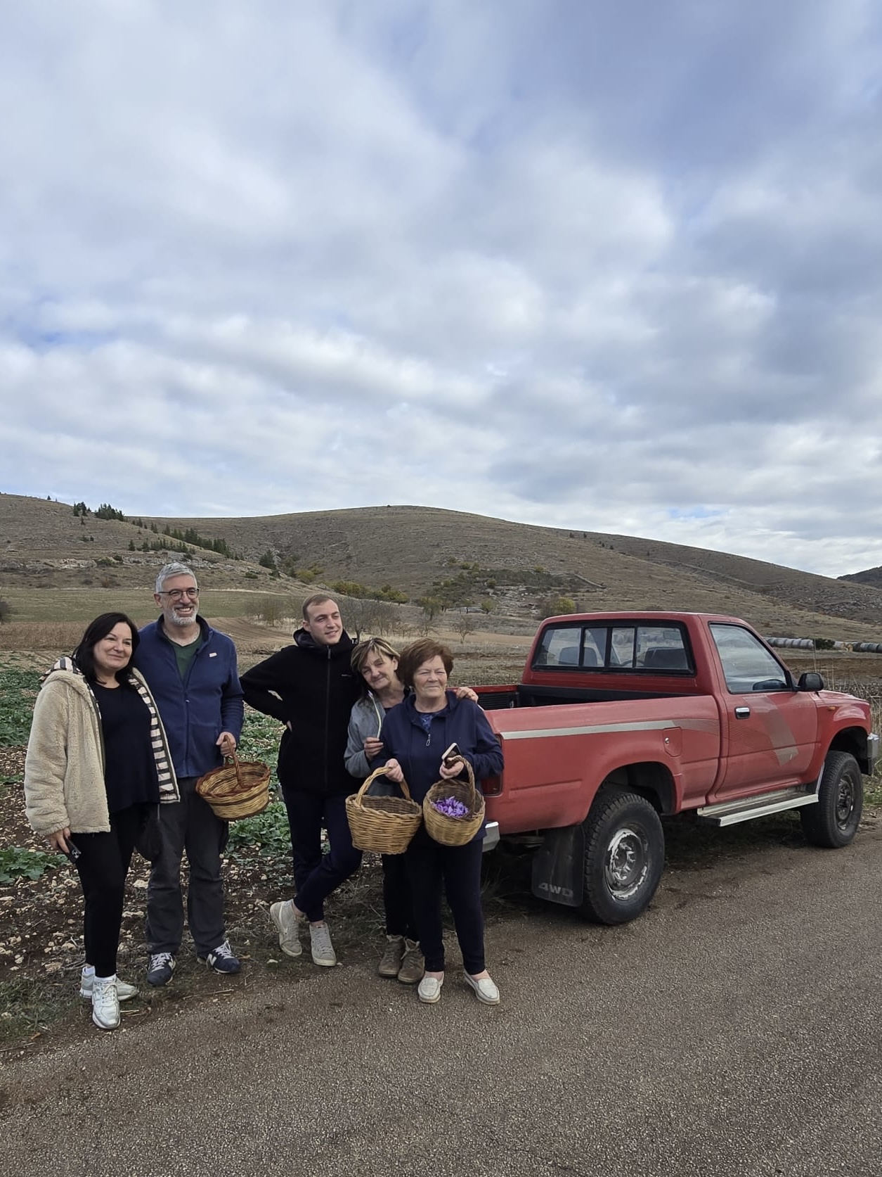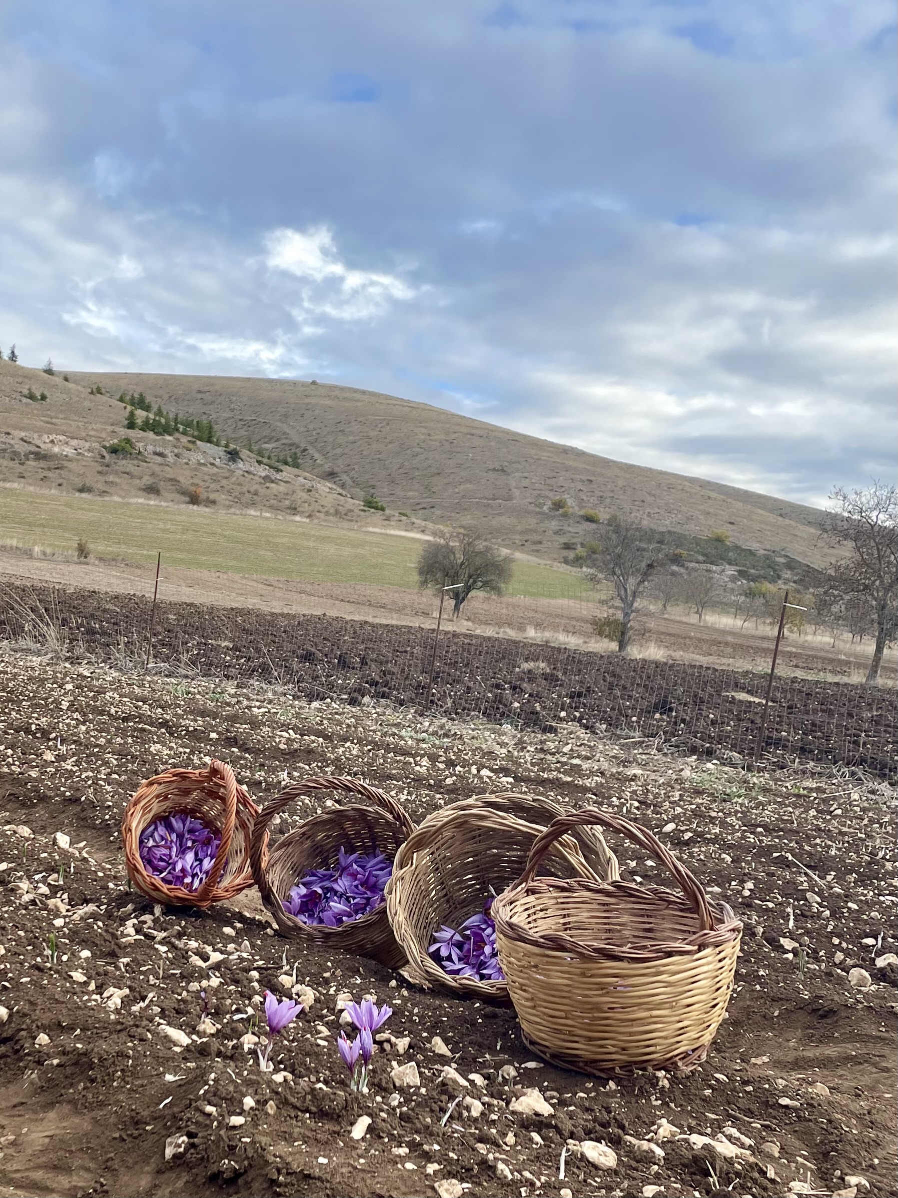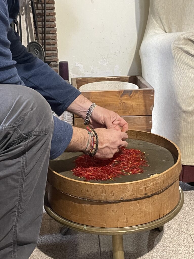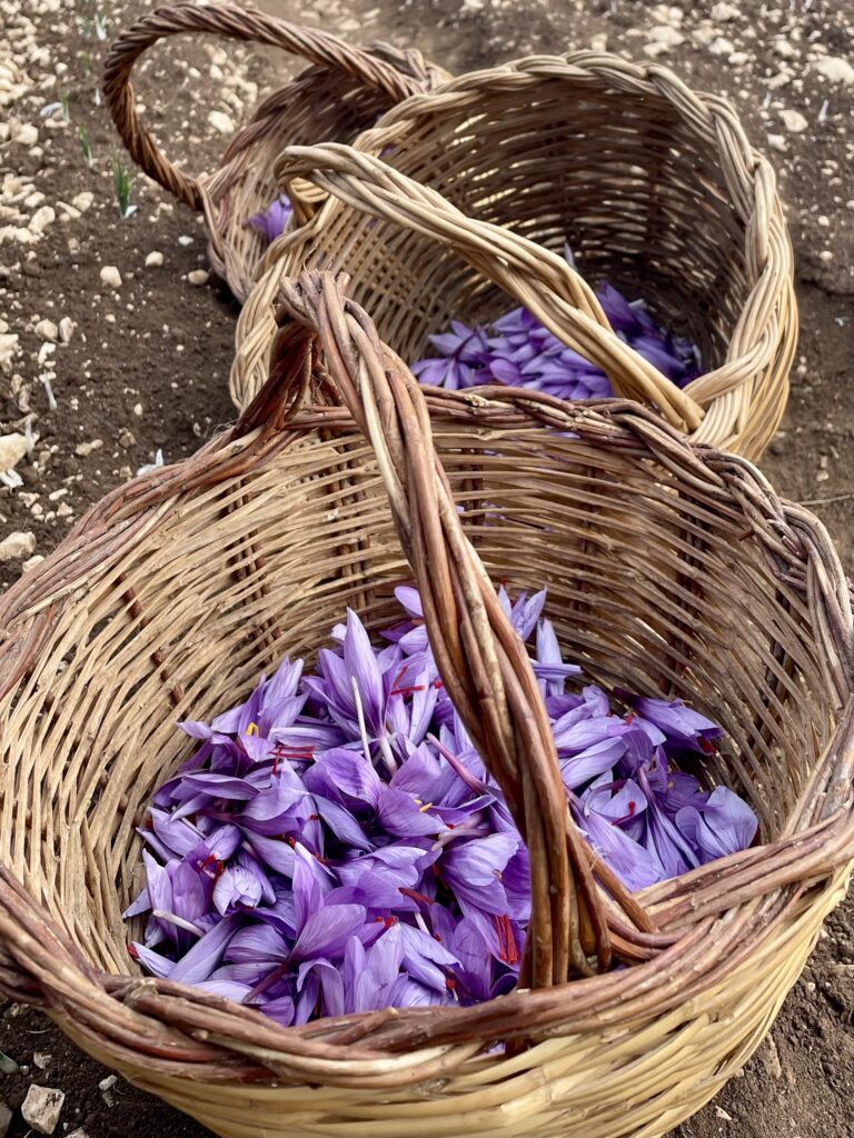 Twee maand later mocht ik met Massimiliano mee om te helpen bij het oogsten. Al snel merk je hoe lastig de pluk is. Krokussen staan enorm kort bij de grond en je voelt het veldwerk in de knieën en de kuiten. Echt veldwerk dus. Na een paar uur plukken gingen we met volle mandjes verse krokussen opnieuw het dorp in, waar we als gelegenheidsplukkers bijzonder gastvrij werden opgewacht met koffie en taart, om daarna zo snel mogelijk opnieuw aan het werk te worden gezet bij de kwekers thuis.
