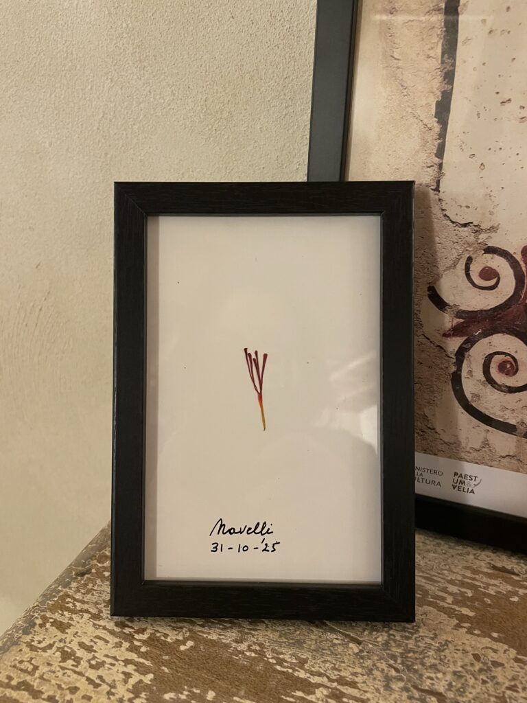 Iedere saffraankrokus heeft drie rode stampers. Maar net zoals je soms een klavertje vier vindt, kan je bij de Crocus sativus uitzonderlijk een krokus met vijf stampers vinden. De ochtend van 31 oktober 2025 vond Massimiliano, die naast me zat, er eentje. Onverwacht kreeg ik het kleinood met een glimlach toegestopt. Ik stak het voorzichtig tussen een dubbelgeplooid vel keukenpapier in mijn notitieboekje en nam het mee naar Rome.